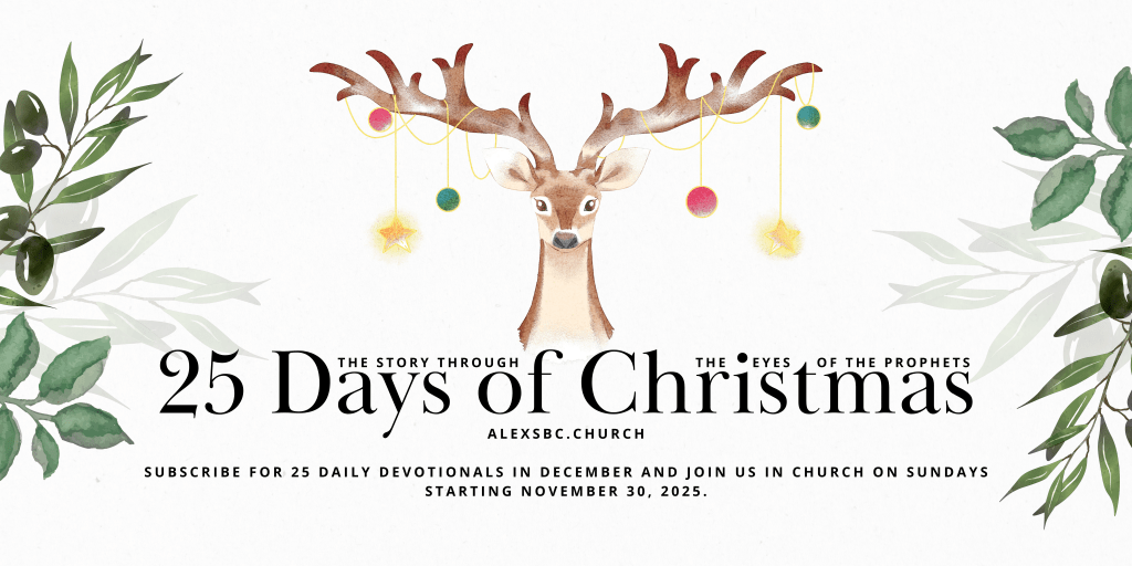 This holiday season, Heaven meets Earth as we look at the Christmas story as told through the prophets hundreds of years before the shepherds were drawn to that small manger in Bethlehem. Subscribe at alexsbc.church to receive daily devotionals via email leading up to Christmas. Follow Alex Southern Baptist Chapel on Facebook to see the devotional videos. Join us on Sunday mornings as we supplement the 25 Days of Christmas with teaching from the Old and New Testaments about the birth of Jesus.